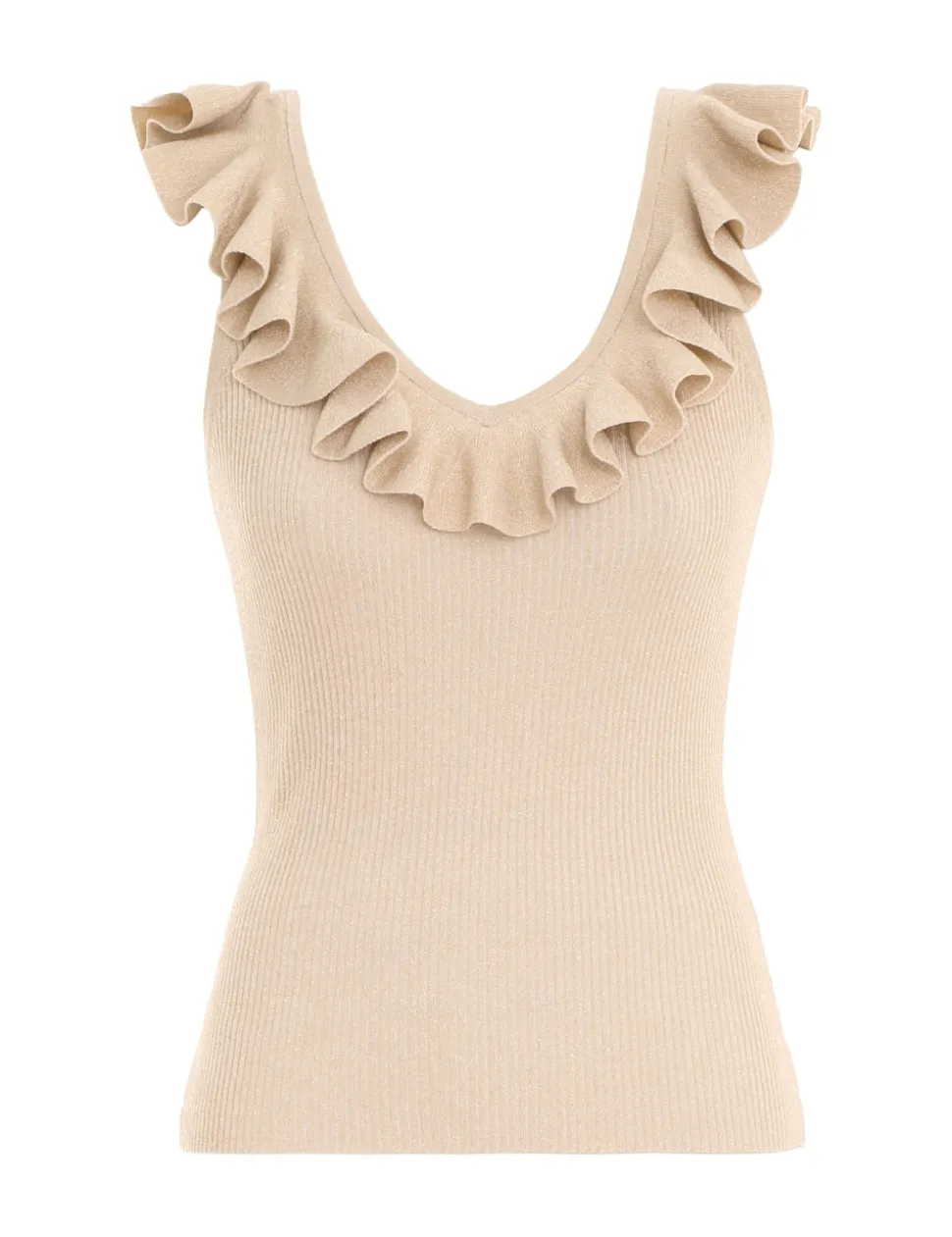 The Alight Frill V-Neck Top In Cream Lurex From Our Resort Swim 2024 Collection. A Ribbed Knit, Fitted Tank With A Frilled V-Neckline.- Fitted, Ribbed Tank