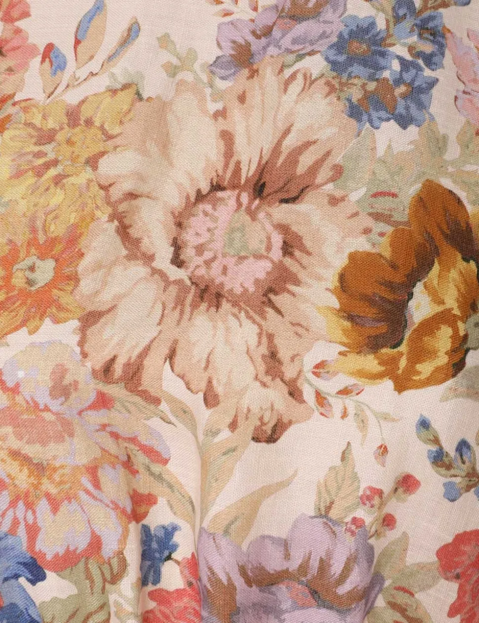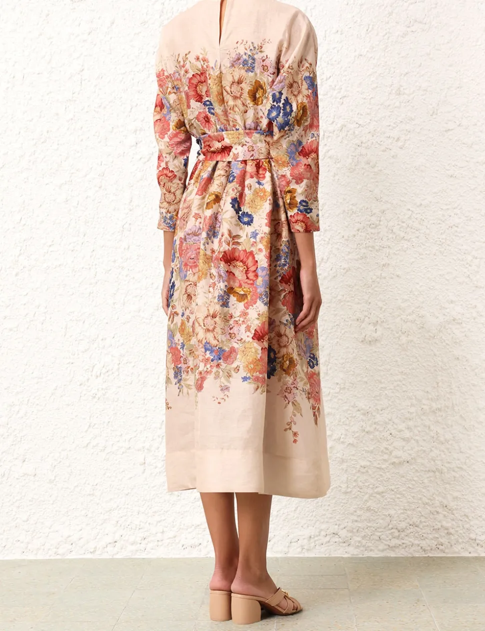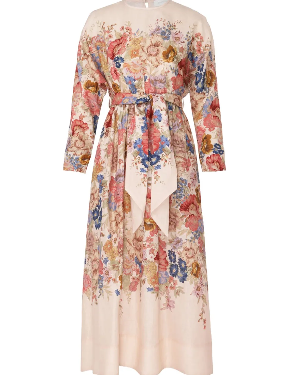 The August Tie Waist Midi Dress In Cream Floral From Our Resort Swim 2024 Collection. A Linen Long Sleeve Dress Featuring A Removable Waist Tie And A Contrast Bind.- Linen Midi Dress