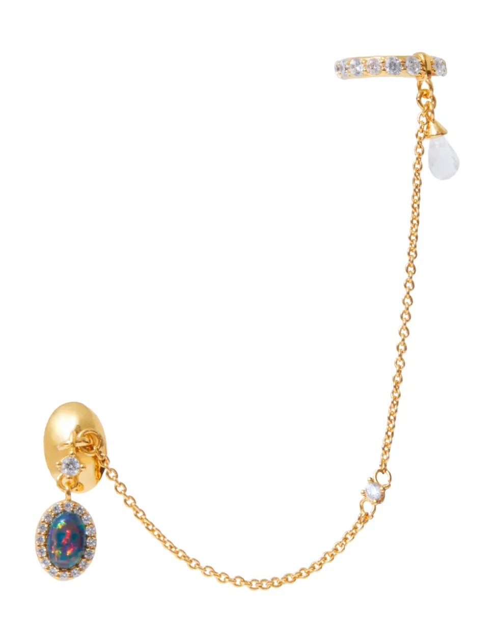 The Austral Huggie In Gold/Green From Our Fall 2023 Collection, Luminosity. A Gold Plated Earring Featuring A Synthetic Opal And Cubic Zirconia Stones Through.- 20Kt Gold Plated
