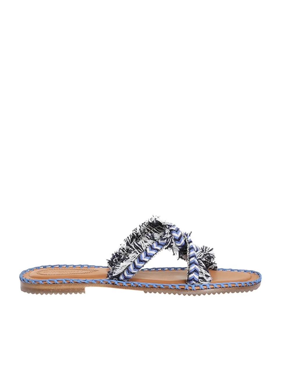The Braided Strap Sandal In Blue Multi From Our Summer Swim 2023 Collection. A Flat Leather Sandal Featuring Contrast Braided Raffia Straps.- Made In Spain