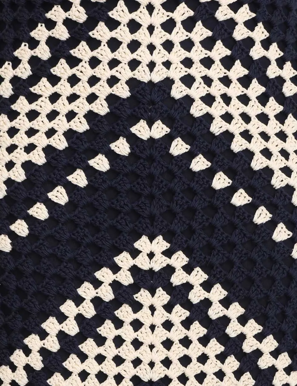 The Chintz Crochet Fringed Skirt In Cream/Navy From Our Summer Swim 2023 Collection. A Crochet Midi Skirt Featuring A Fringed Hem And Contrast Elastic Waistband.- Crochet Midi Skirt