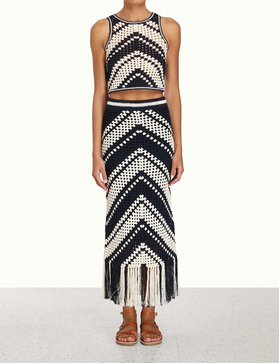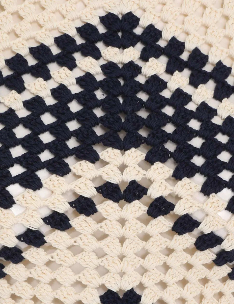 The Chintz Hand Crochet Tank In Cream/Navy From Our Summer Swim 2023 Collection. A Hand Crochet Tank Featuring A Contrast Trim Edge And A Keyhole Self Tie Closure.- Hand Crochet Crop Tank