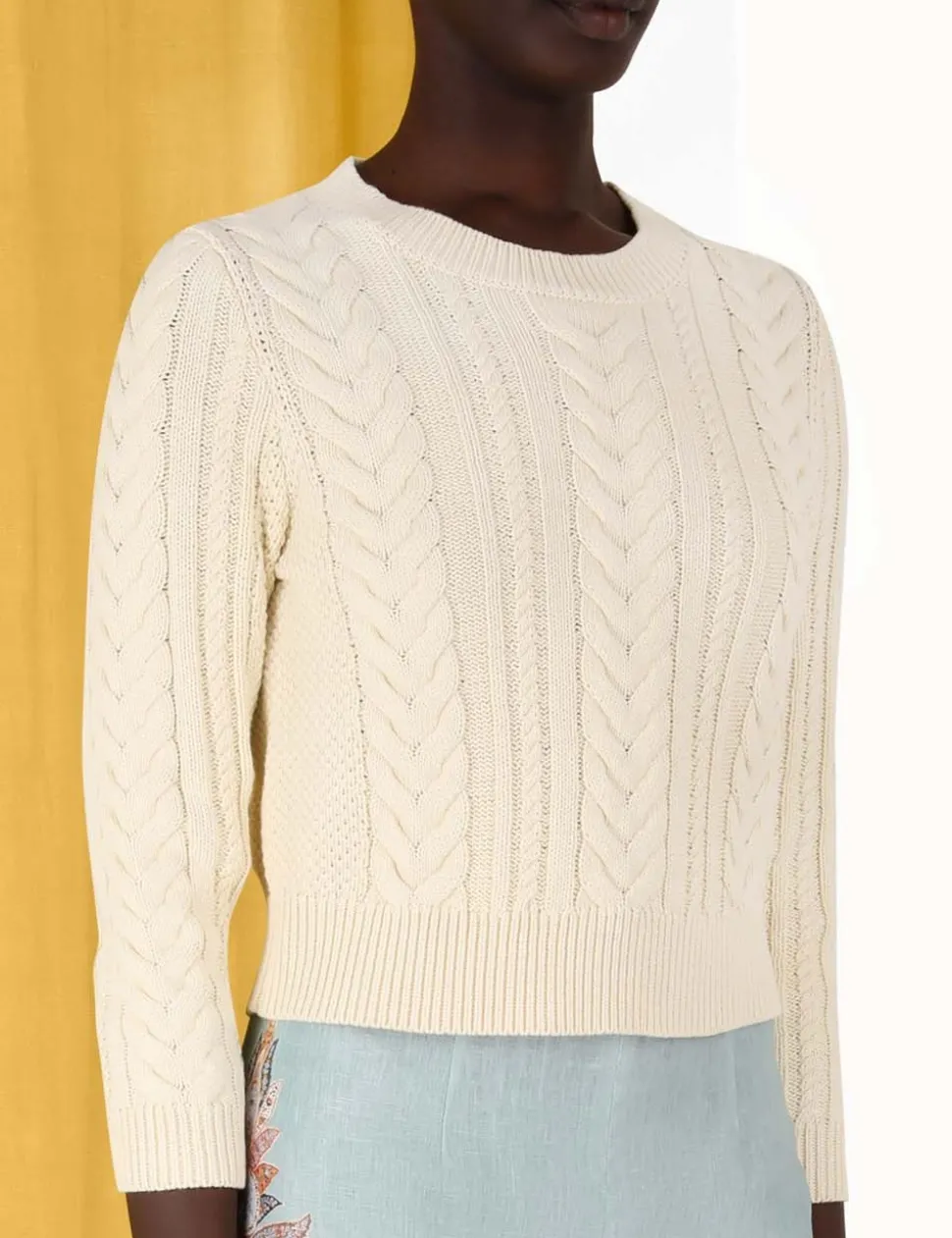 The Devi Cable Knit Top In Cream From Our Summer Swim 2023 Collection. A Short Sleeve Top Featuring A Cable Knit Throughout.- Knitted Top