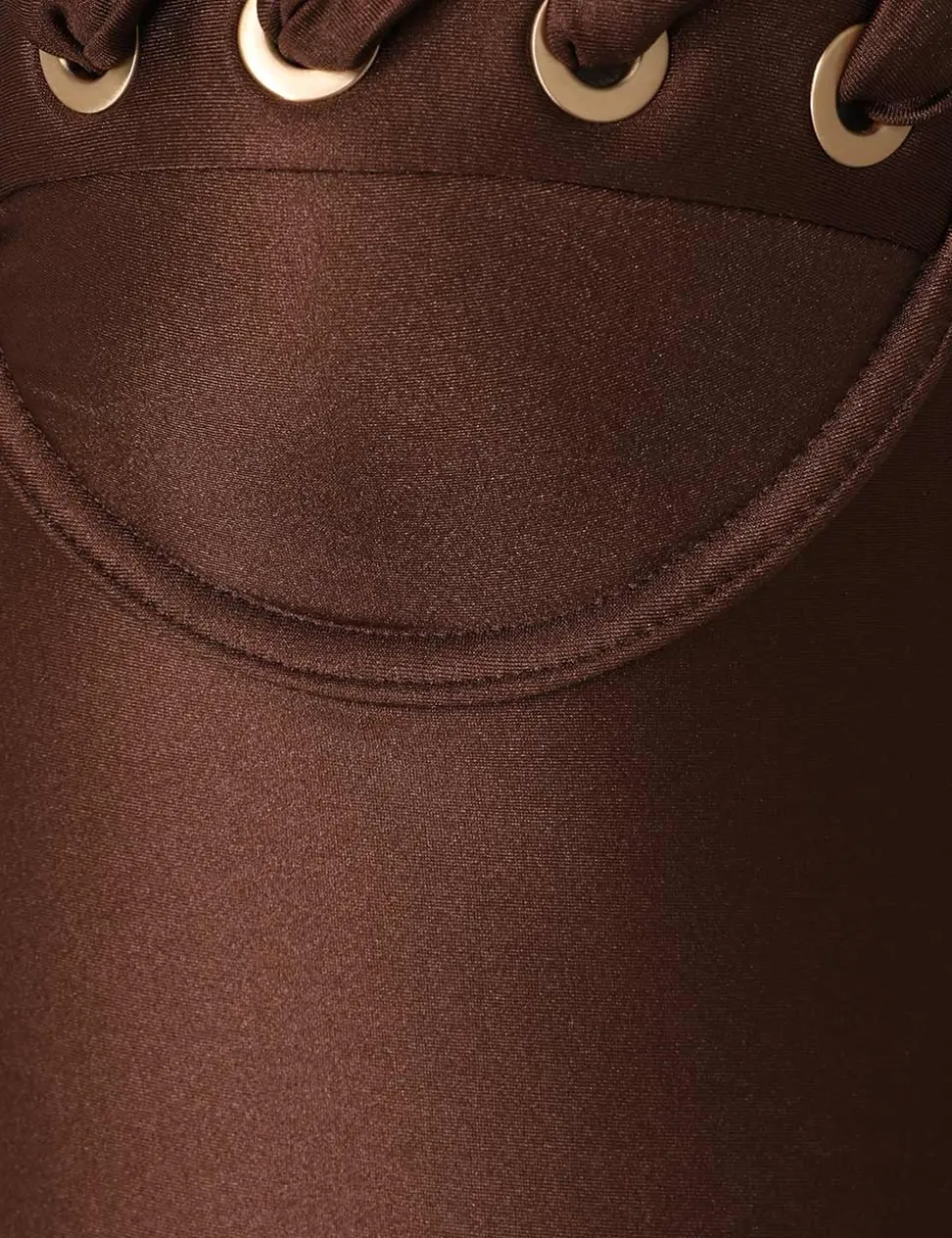 The Devi Eyelet Balconette 1Pc In Chocolate From Our Summer Swim 2023 Collection. A Shiny Lycra One Piece Featuring A Balconette Bust With Foam Cups And Eyelets, Removable Straps, Boning At The Side Seams And Underwire.- Shiny Lycra One Piece