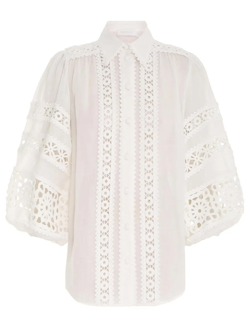 The Devi Spliced Billow Blouse In Ivory From Our Summer Swim 2023 Collection. A Ramie Blouse Featuring A Classic Shirt Collar And Billow Sleeves, Finished With Placement Cutaway Trims Throughout.- Ramie Blouse