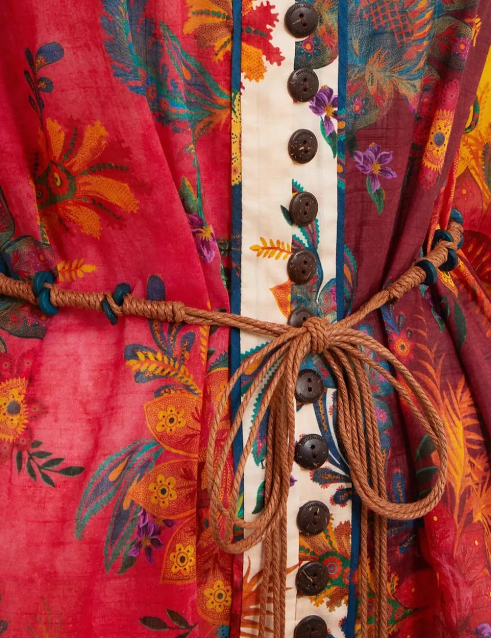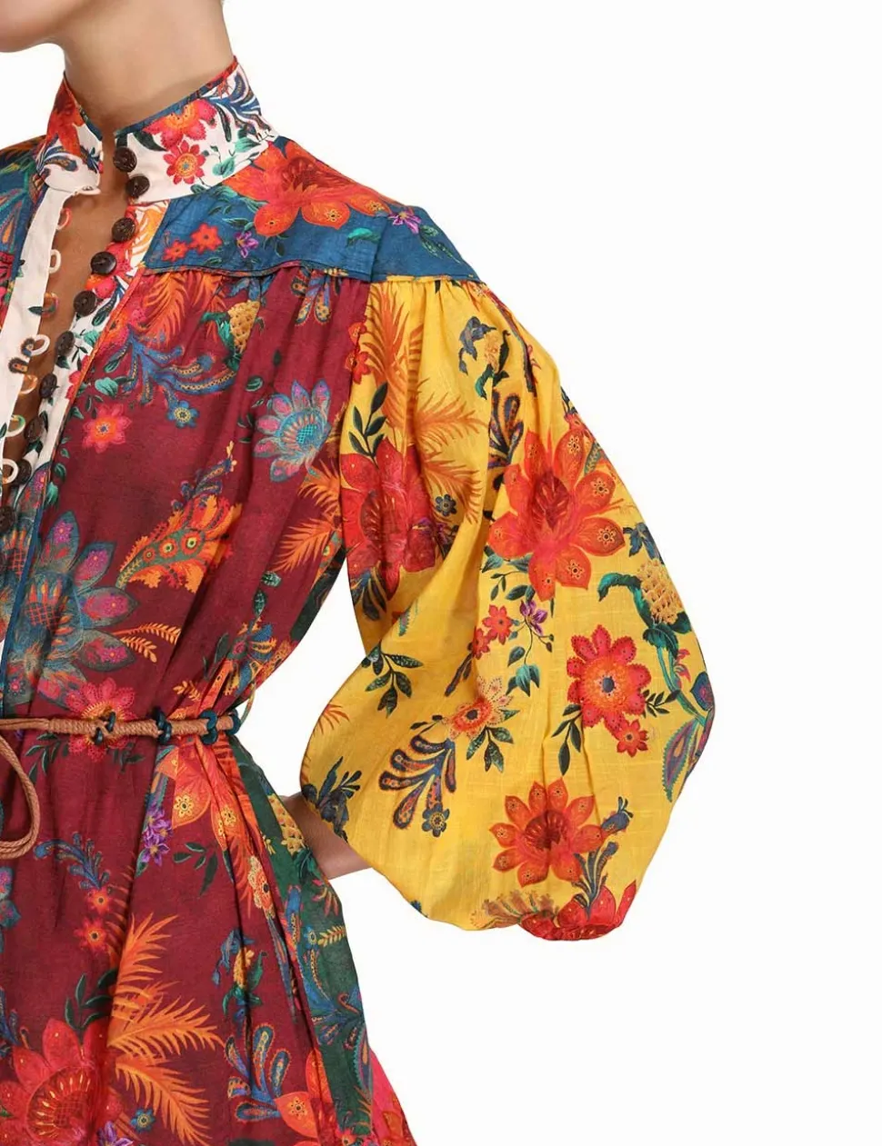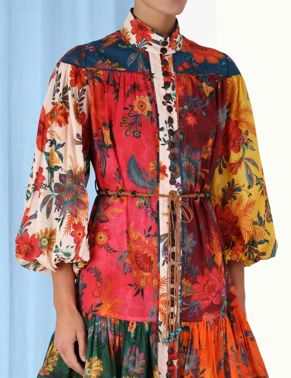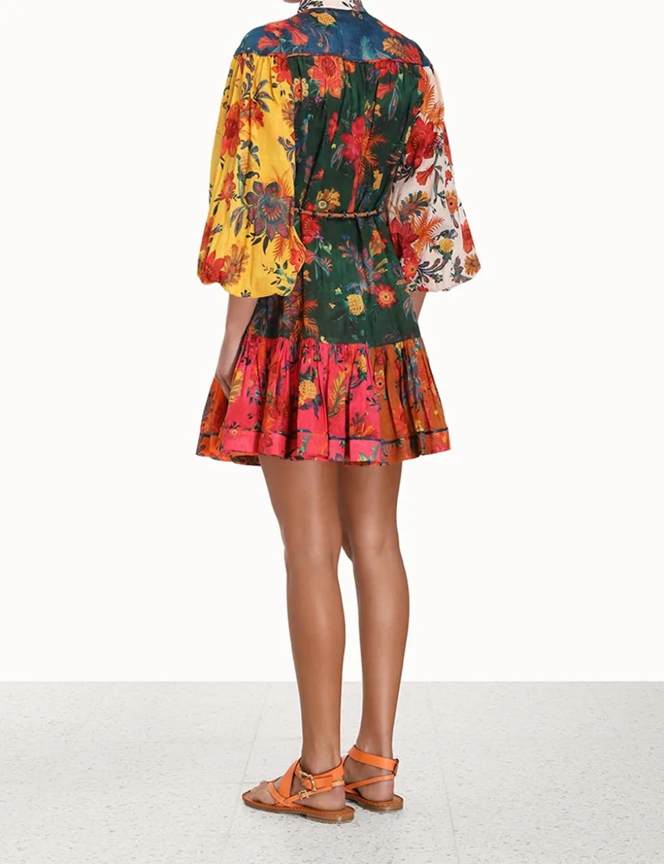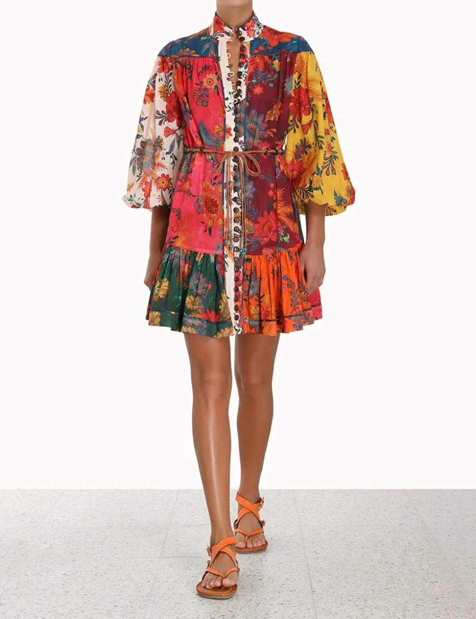 The Ginger Lantern Mini Dress In Spliced From Our Summer Swim 2023 Collection. A Cotton Mini Dress Featuring A Drop Waist, Stand Collar And Centre Front Button Closure.- Cotton Mini Dress