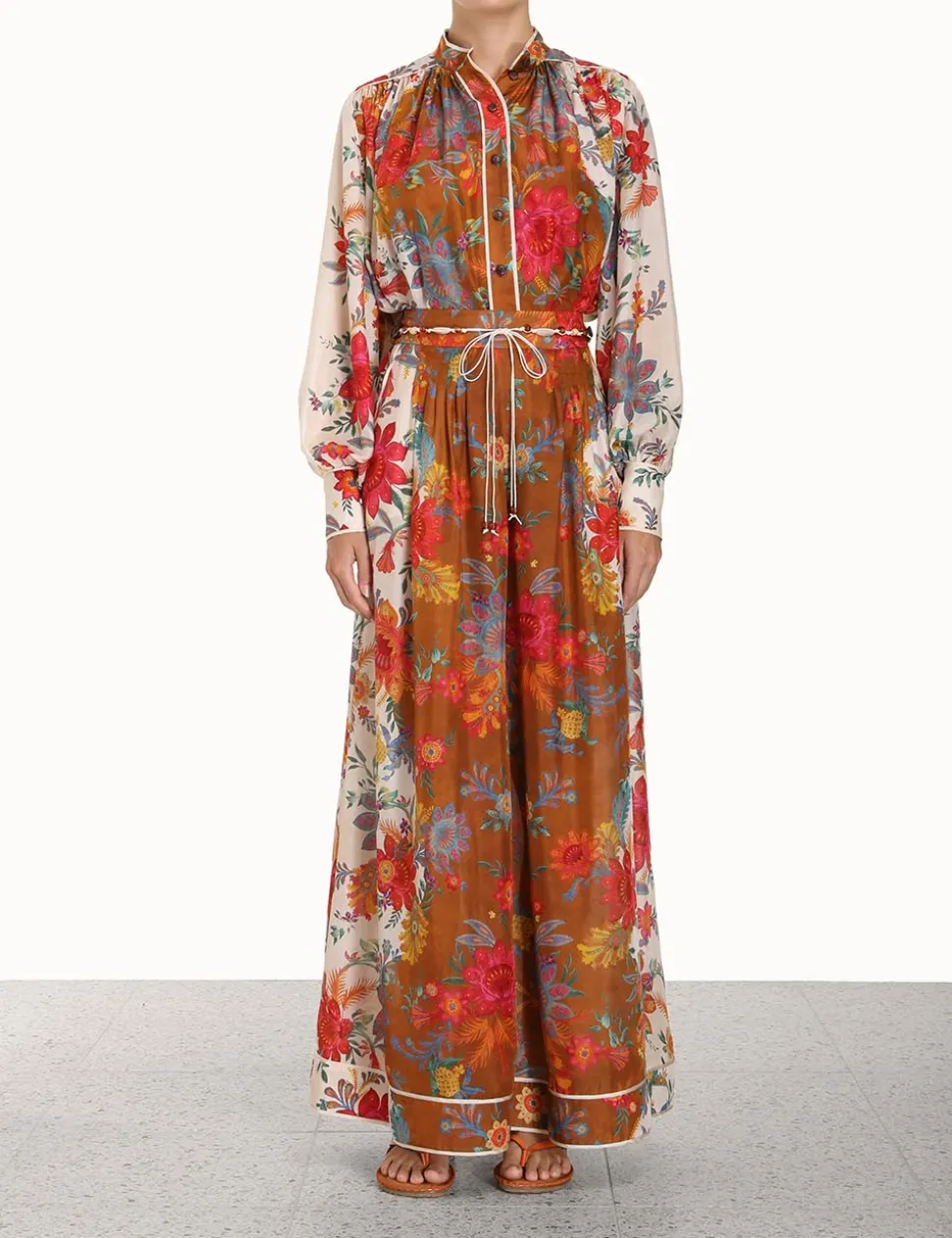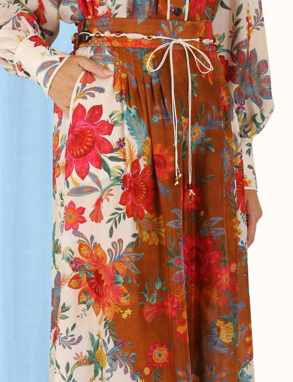 The Ginger Relaxed Pant In Cream/Brown Floralfrom Our Summer Swim 2023 Collection. A Silk Wide Leg Pant Featuring A Beaded Tie Belt And Contrast Piping Throughout.- Silk Wide Leg Pant