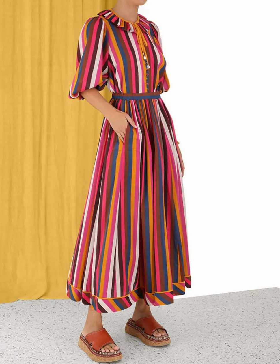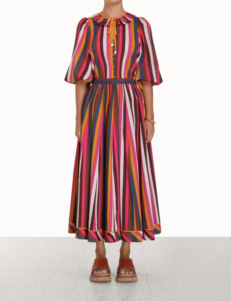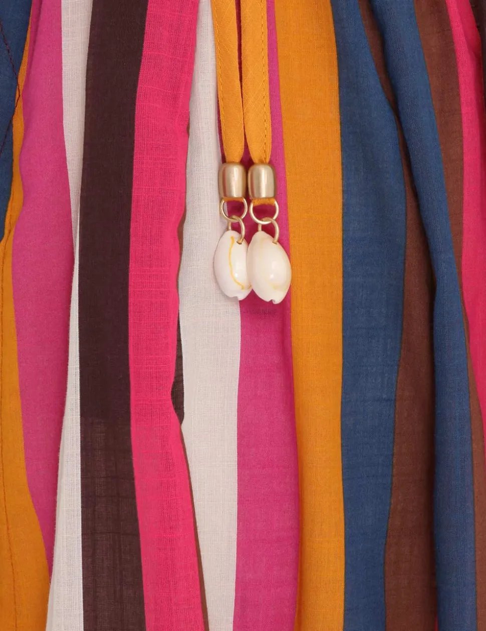 The Ginger Ruffle Neck Top In Multi Stripe From Our Summer Swim 2023 Collection. A Cotton Top Featuring Blouson Sleeves And A Ruffled Neckline.- Cotton Top