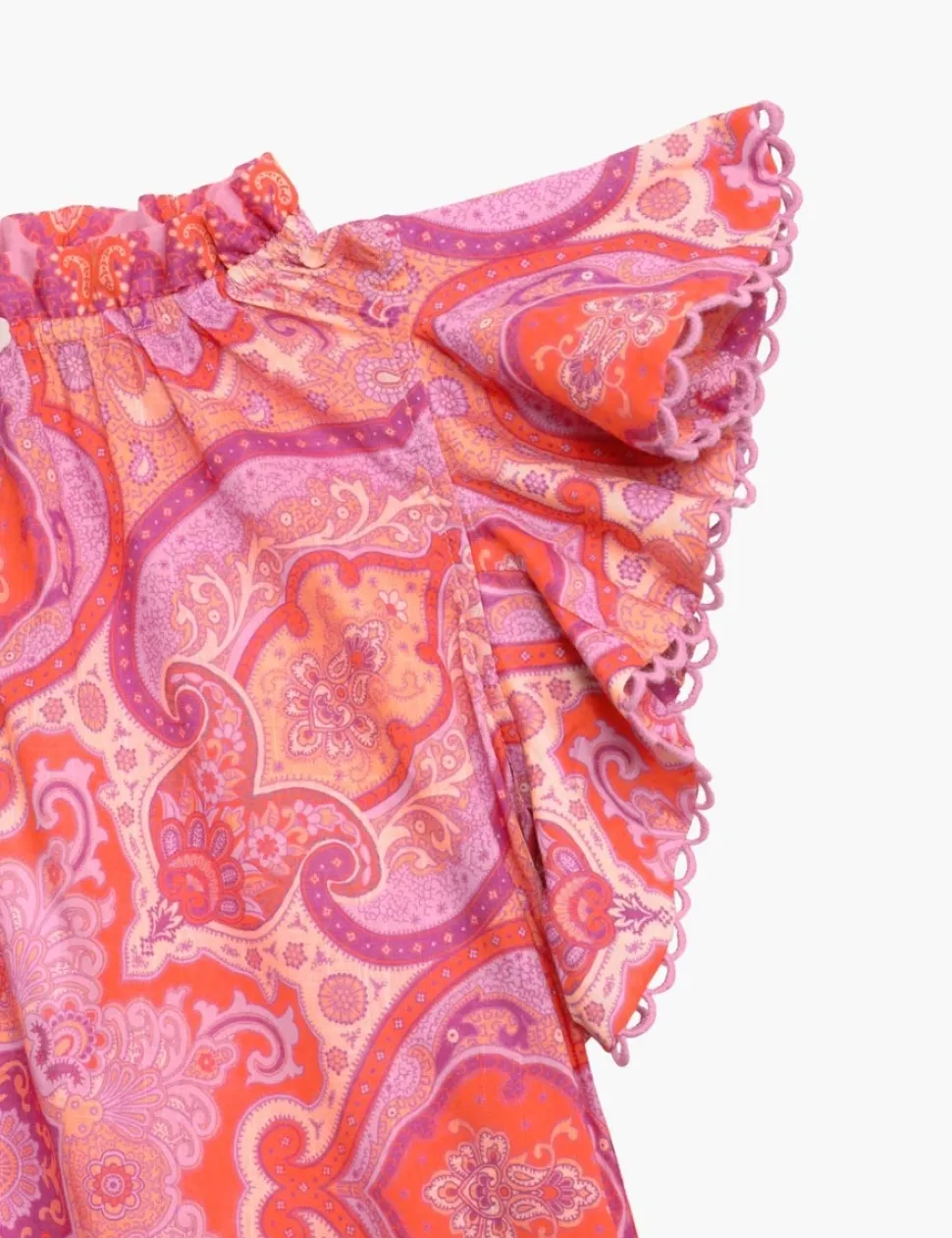 The Halcyon Flounce Sleeve Dress In Pink/Purple Paisley From Our Summer Swim 2023 Collection. A Cotton Dress Featuring Frills Throughout.- Cotton Dress