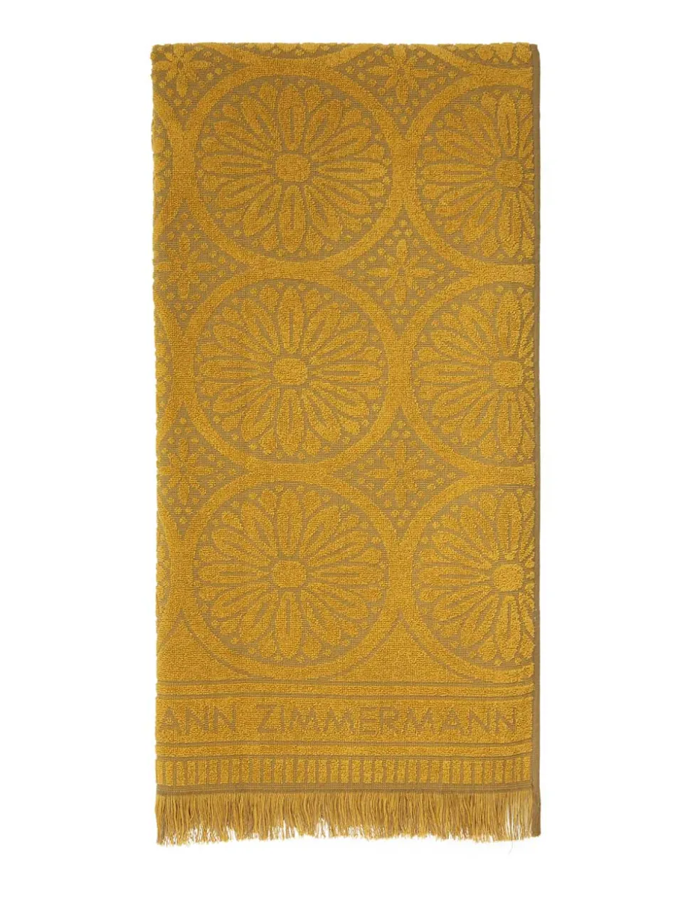 The Jacquard Towel In Gold From Our Resort 2024 Collection, Matchmaker. A Cotton Jacquard Towel With Fringed Edging And Branded Ends.- Cotton Jacquard
