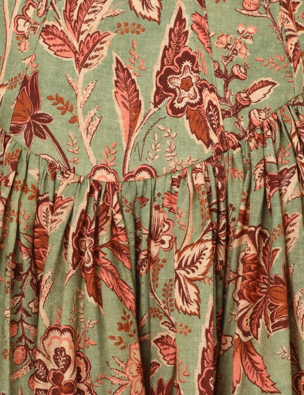 The Junie Panelled Mini Dress In Sage/Brown Floral From Our Resort Swim 2024 Collection. A Linen Mini Dress Featuring Panelling Along The Bodice And A Contrast Placement Print Hem Band.- Linen Mini Dress
