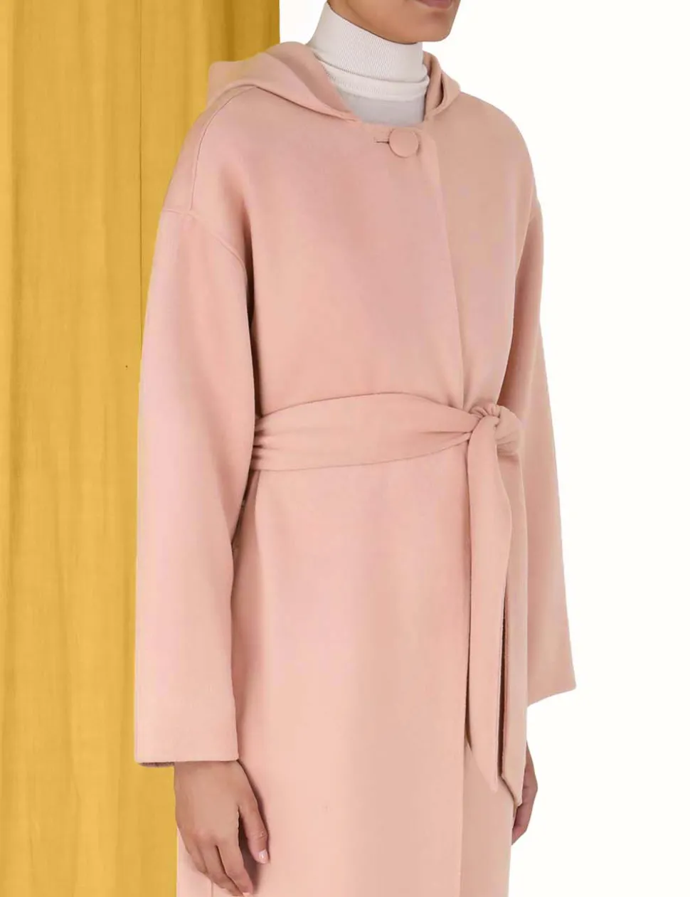 The Luminosity Felted Hooded Coat In Dusty Pink From Our Fall 2023 Collection, Luminosity. A Wrap Style Wool Coat Featuring A Hood And In Seam Pockets.- Wool Coat