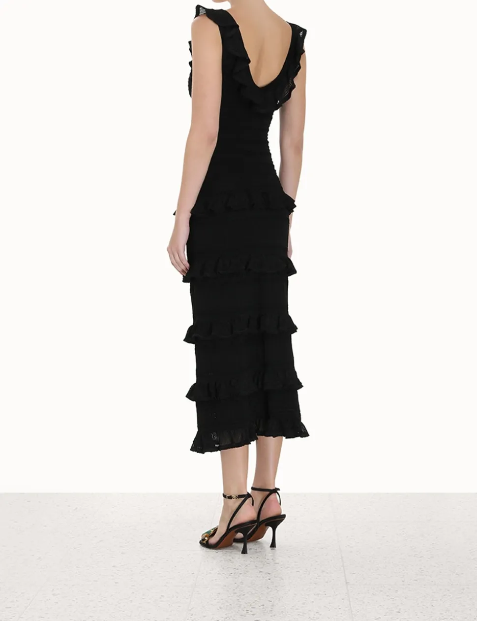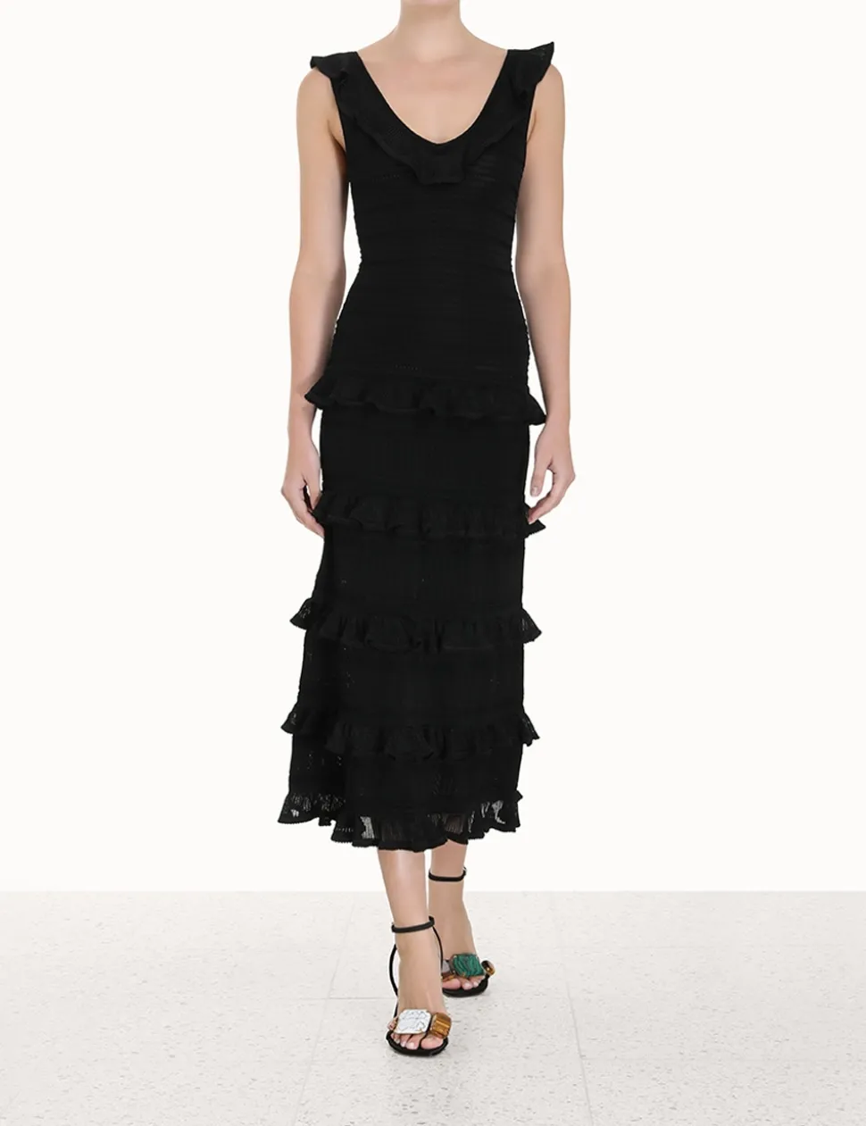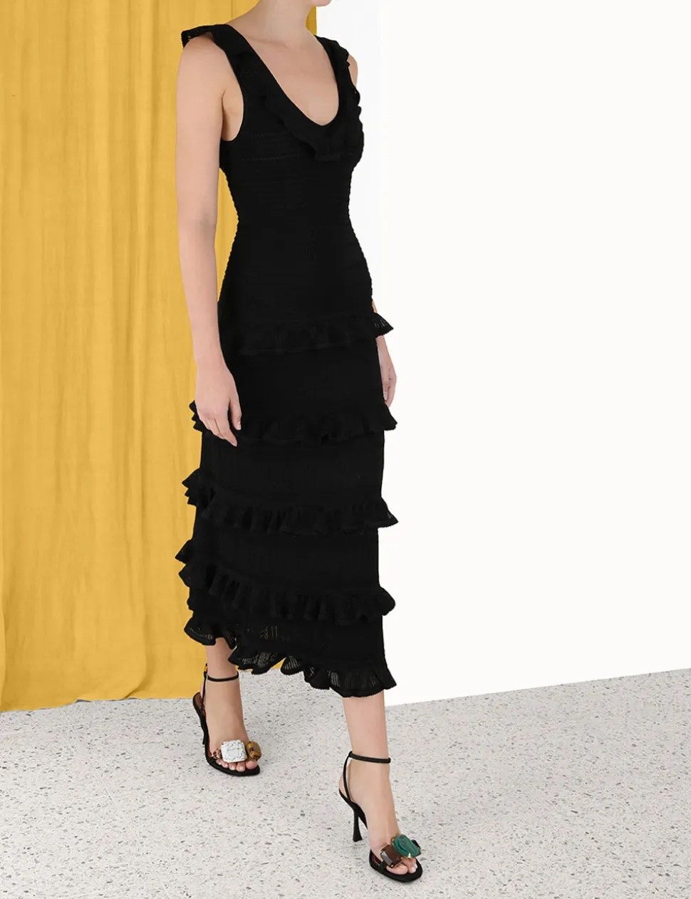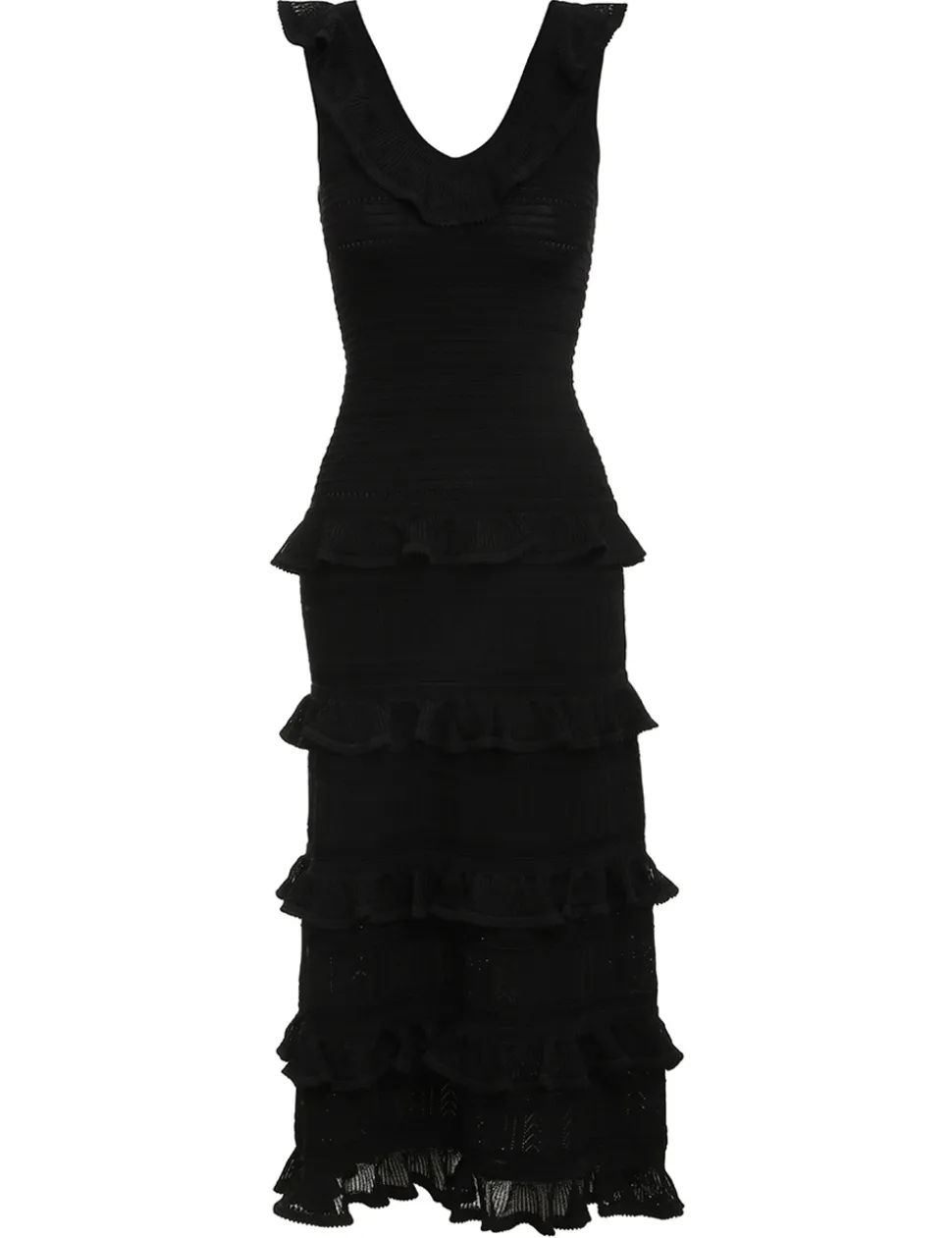 The Luminosity Ruffle Tank Dress In Black From Our Fall 2023 Collection, Luminosity. A Knitted Midi Dress Featuring Ruffled Details Throughout.- Textured Knit