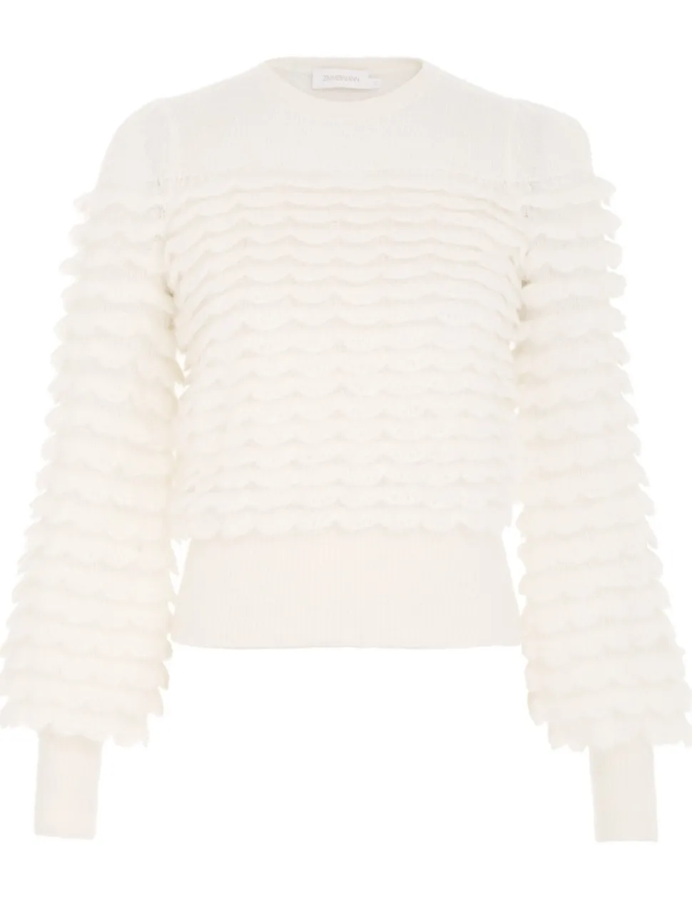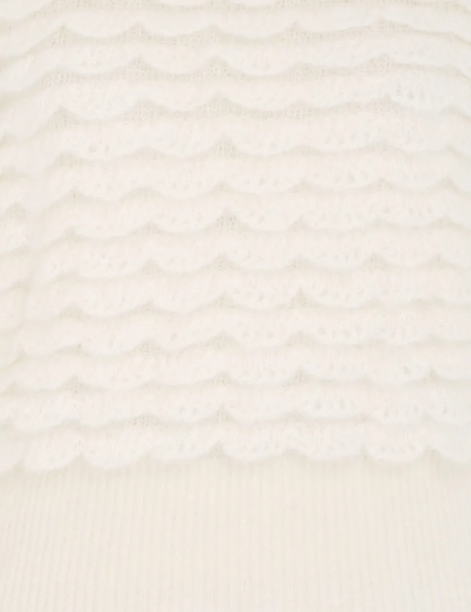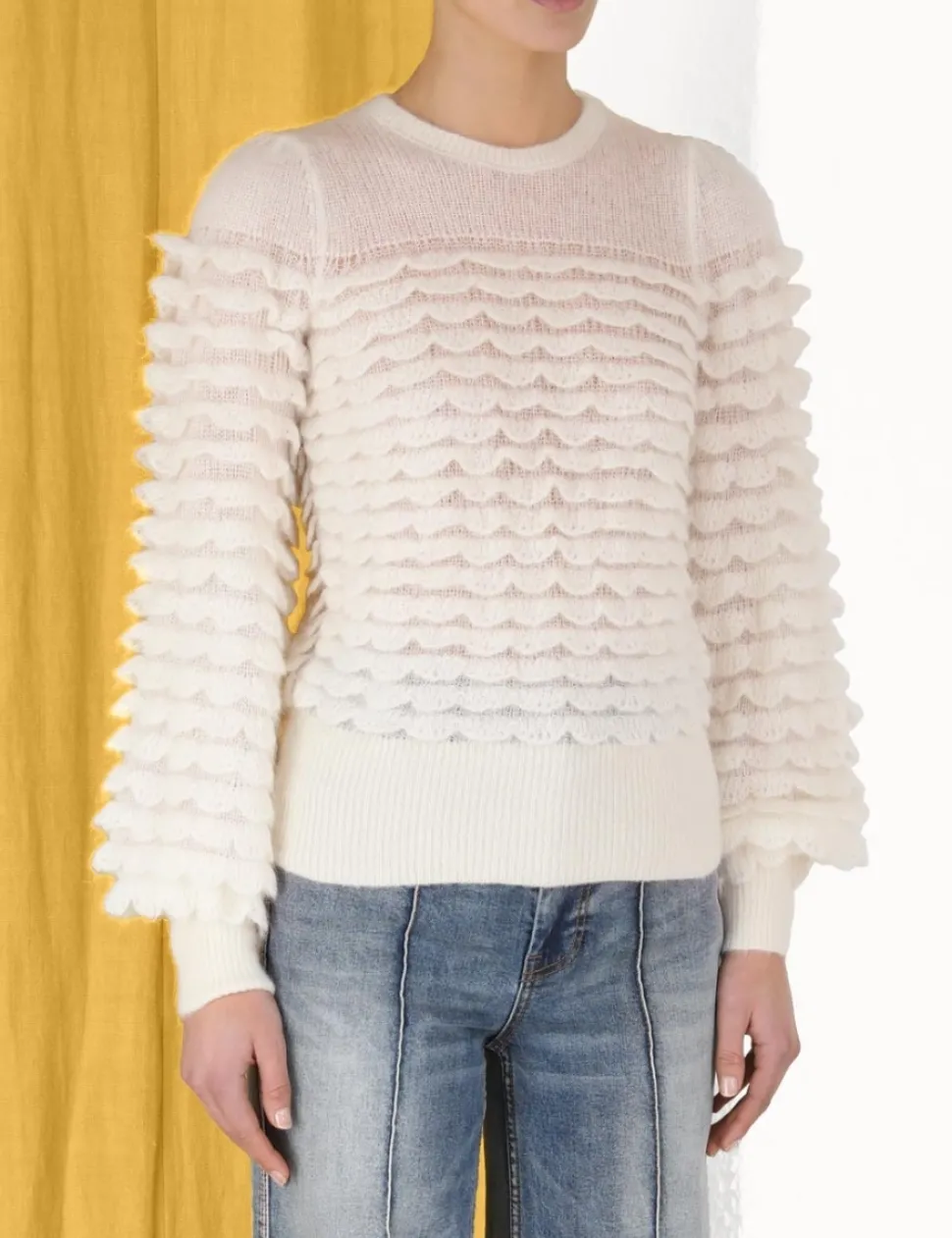The Luminosity Scallop Sweater In Cream From Our Fall 2023 Collection, Luminosity. An Alpaca Wool Blend Knit Featuring Scalloped Frills Throughout.- Alpaca Wool Blend