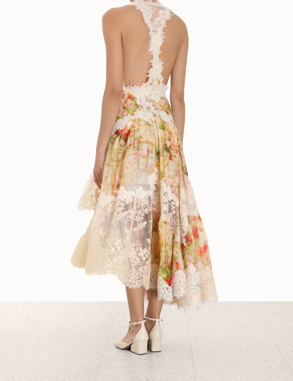 The Luminosity Splice Lace Dress In Garden Scene From Our Fall 2023 Collection, Luminosity. A Silk Linen Dress Featuring Spliced Panels Of Lace Throughout, Plunging Neckline And Full, Asymmetric Hem.- Racer Back Dress