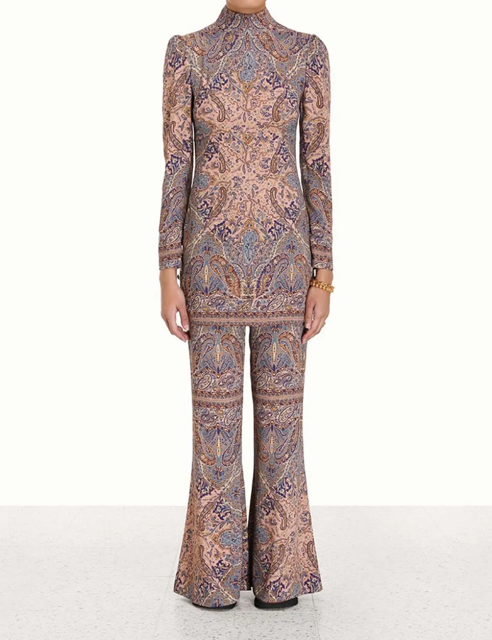 The Lyrical Flare Pant In Paisley Indigo Print From Our Fall 2023 Collection, Luminosity. A Fitted Flare Pant Featuring A Paisley Print Throughout.- Paisley Flare Pant