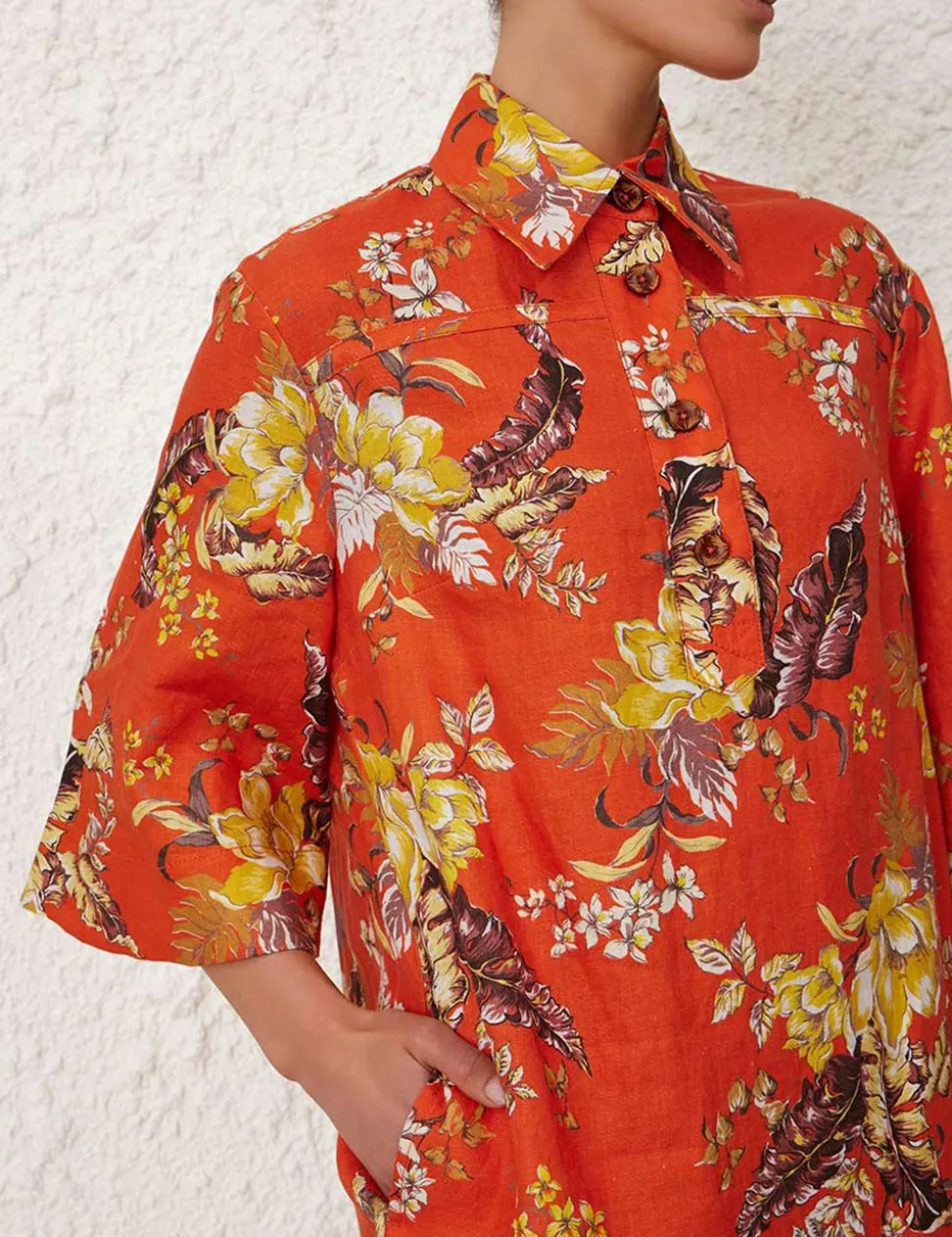 The Matchmaker Tunic Dress In Red Tropical Floral From Our Resort 2024 Collection, Matchmaker. A Linen Tunic Dress Featuring Wide Sleeves And A Placement Print Throughout.- Linen Mini Dress