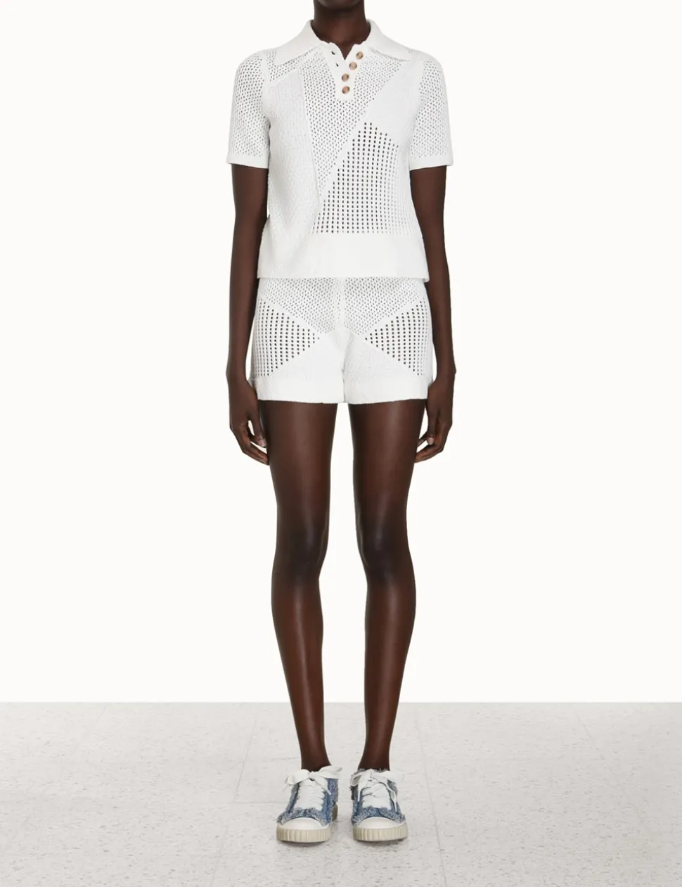 The Raie Mesh Knit Shorts In White From Our Summer Swim 2023 Collection. A Knitted Short Featuring Waist Ties.- Cotton Yarn