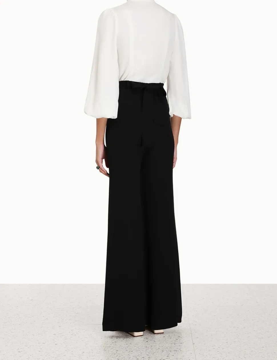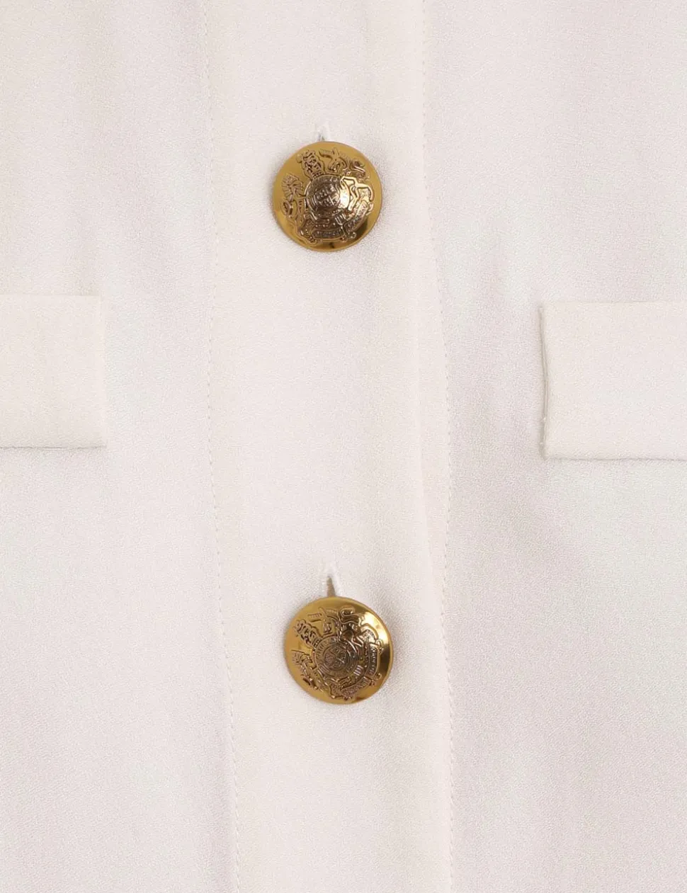 The Utility Body Shirt In Cream From Our Fall 2023 Collection, Luminosity. A Long Sleeve Blouse Featuring A Mandarin Collar And Custom Gold Buttons Down The Centre Front.- Blouson Sleeves With Elastic Cuffs