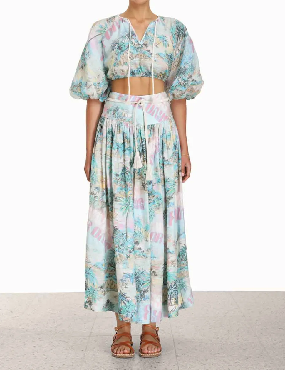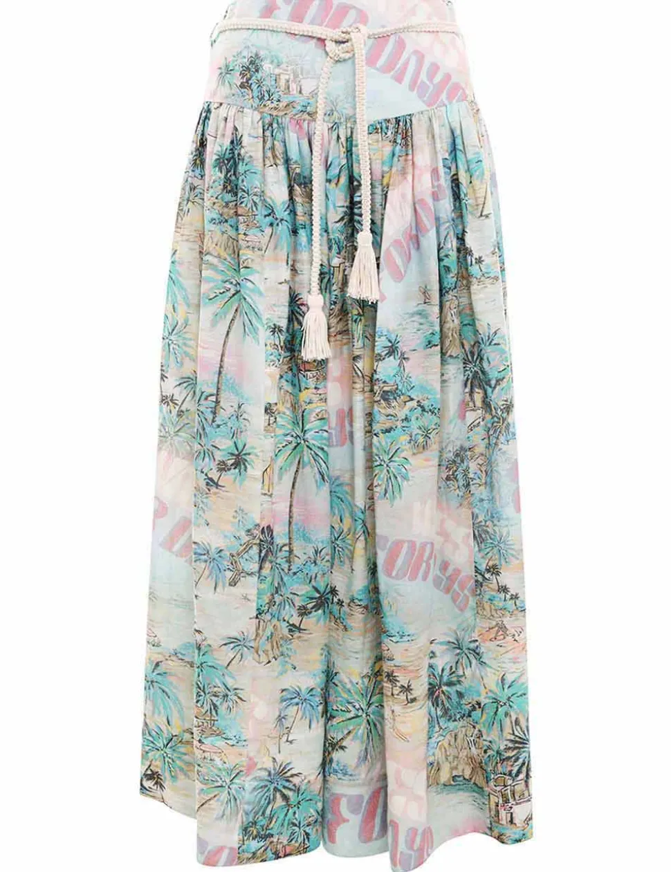 The Vacay Midi Skirt In Blue Multi From Our Summer Swim 2023 Collection. A Linen Midi Skirt Featuring A Basque Waist And Rope Belt With Fringed Tassel Ends.- Linen Midi Skirt