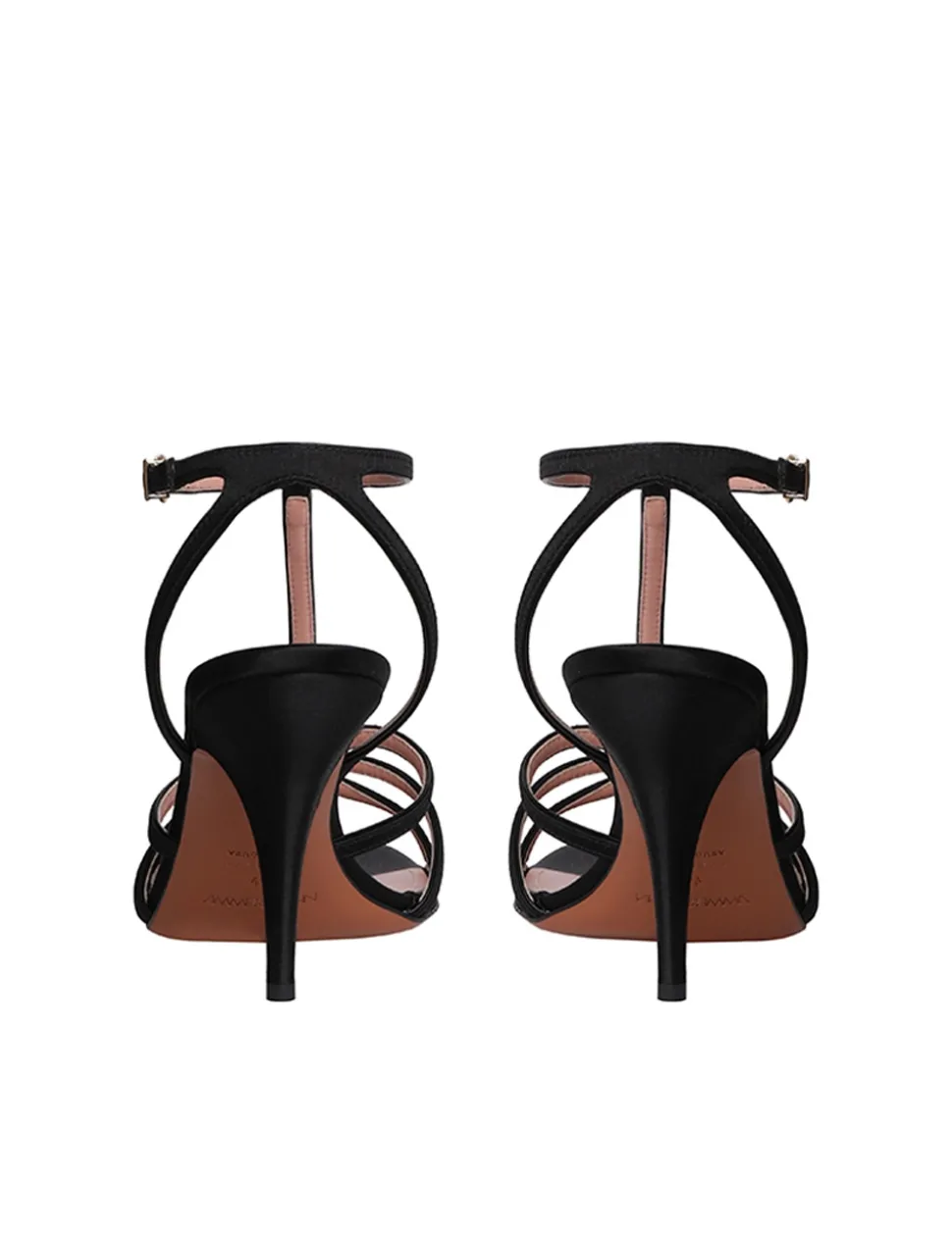 The Aura Mule 85 In Black From Our Resort 2024 Collection, Matchmaker. A Strappy Stiletto Heel Featuring Gold Hardware.- Satin Mule