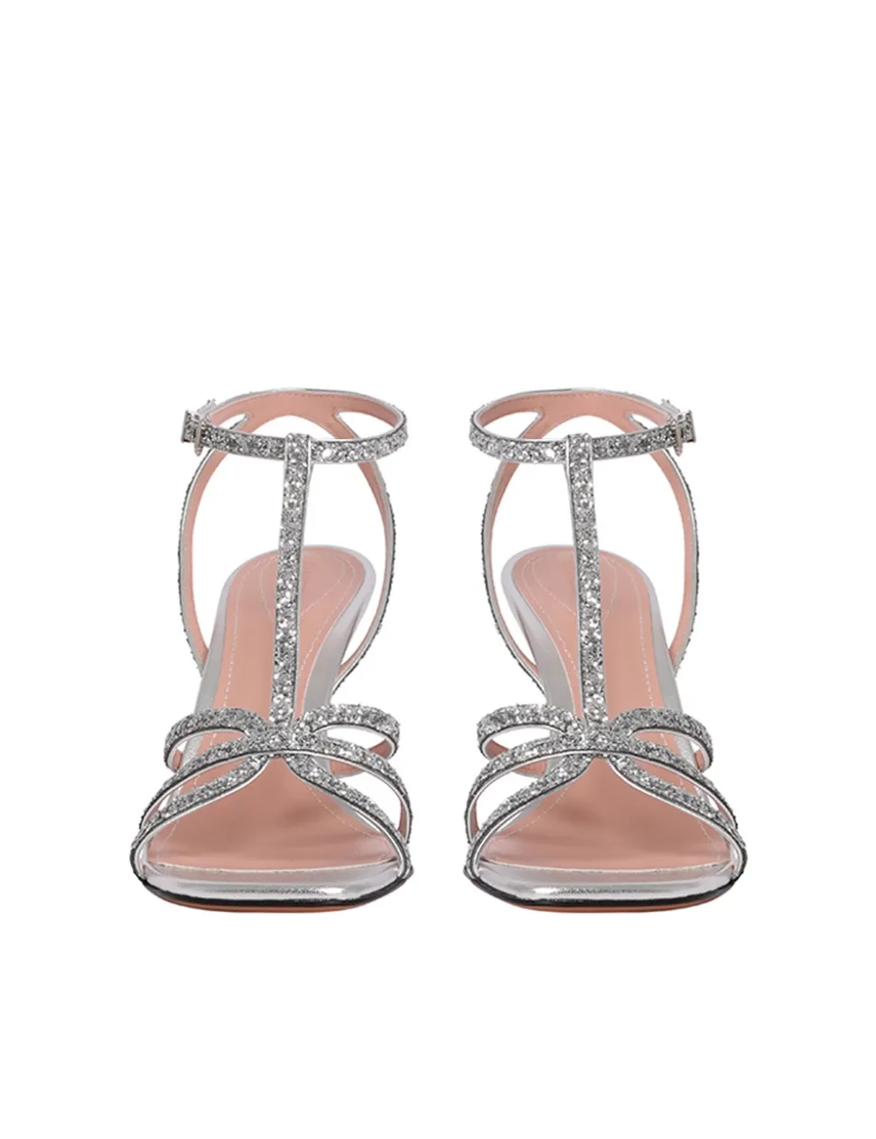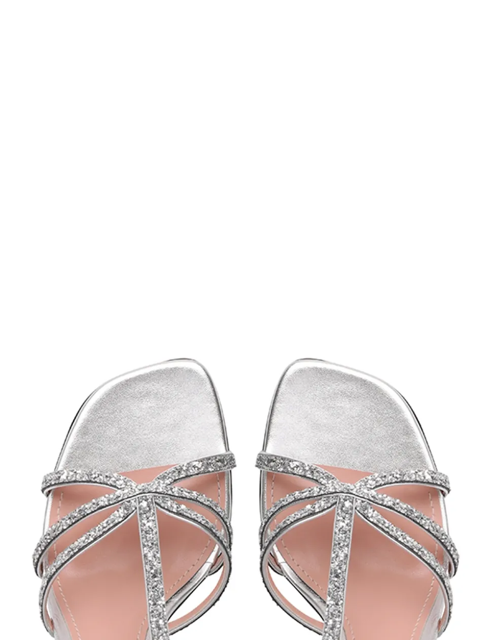 The Aura Mule 85 In Silver From Our Resort 2024 Collection, Matchmaker. A Strappy Stiletto Heel Featuring A Silver Glitter Exterior.- Soft Square Toe