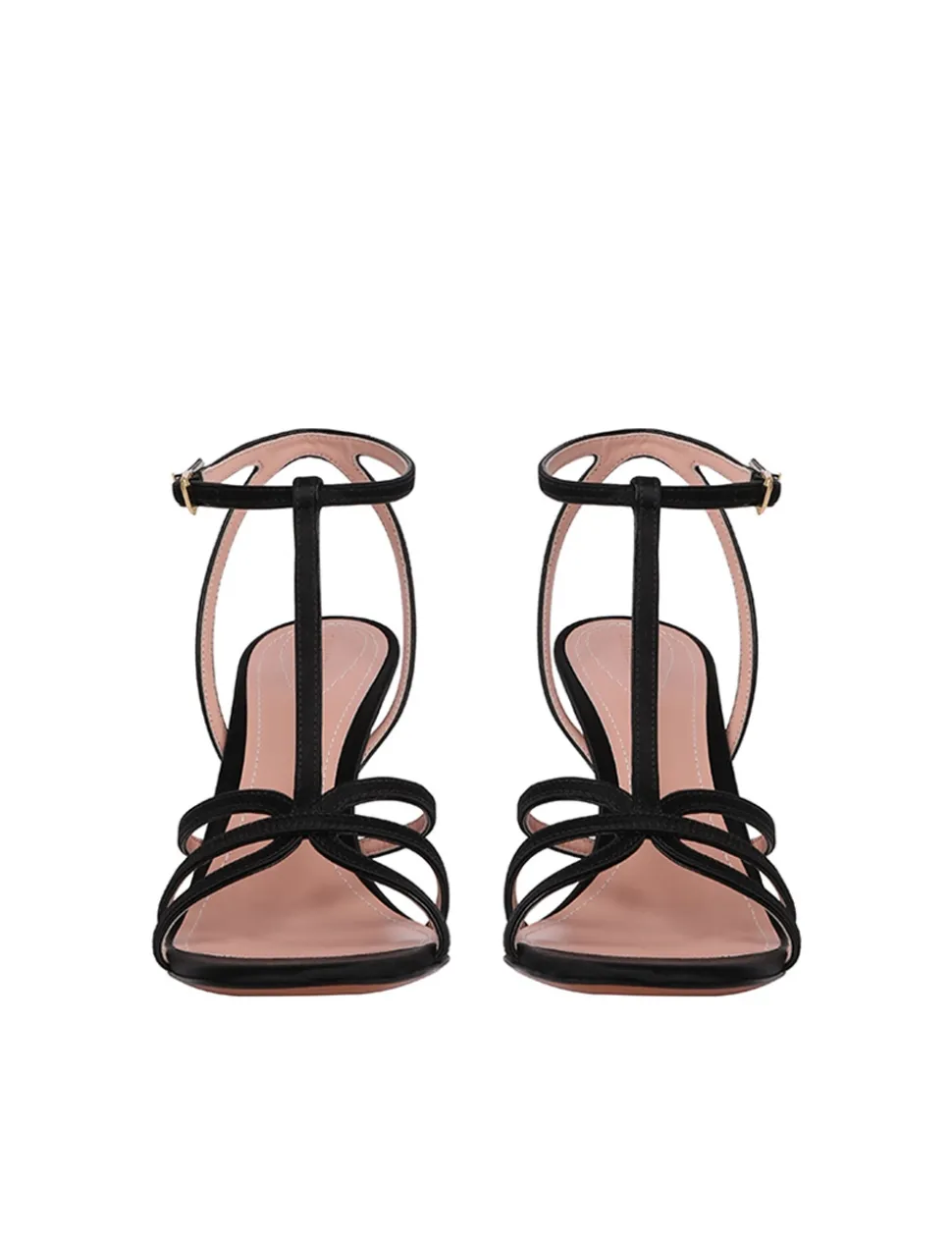 The Aura Mule 85 In Black From Our Resort 2024 Collection, Matchmaker. A Strappy Stiletto Heel Featuring Gold Hardware.- Satin Mule
